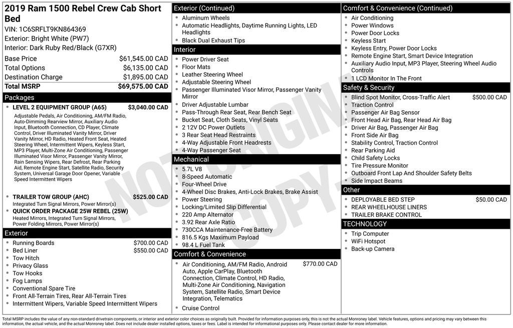 Find your wild side with our HEMI Powered 2019 RAM 1500 Rebel Crew Cab 4X4 with the Level 2 Equipment Package in Bright White! Motivated by a 5.7 Liter HEMI V8 that offers 395hp matched to an 8 Speed Automatic transmission for astonishing passing authority. You will be in total control with this unstoppable Four Wheel Drive truck with eLocker differential and Bilstein Monotube Shocks for incredible off-road capability, scoring nearly 20mpg on the highway. Add some extra swagger to your day with our 1500, which commands the road with 33-inch tires, unique wheels, a large black grille, and dual exhaust.