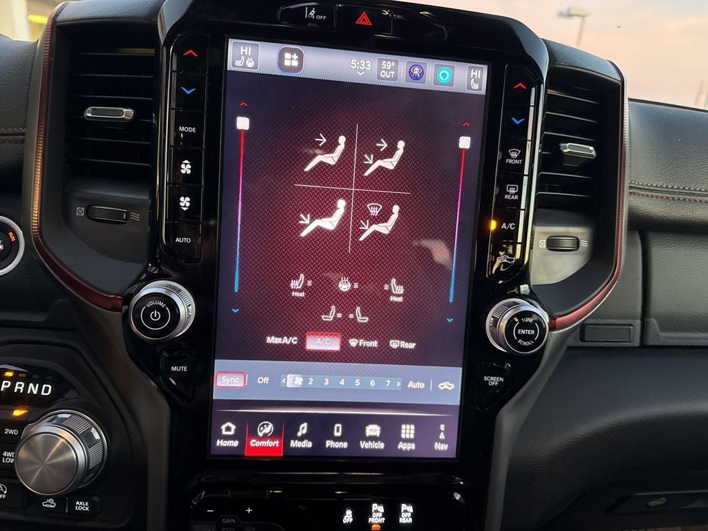 Enhance your journey with our Rebel cabin that is ready for rough terrain thanks to its heated cloth front seats, eight-way power for the driver, a heated-wrapped steering wheel, dual-zone automatic climate control, 12V/115V outlets, a power rear window, and remote start. Off-Road Info Pages enhance the infotainment system, which bundles a 12-inch driver display, 12-inch touchscreen, full-color navigation, WiFi compatibility, Android Auto/Apple CarPlay, Bluetooth®, voice control, and nine-speaker audio.